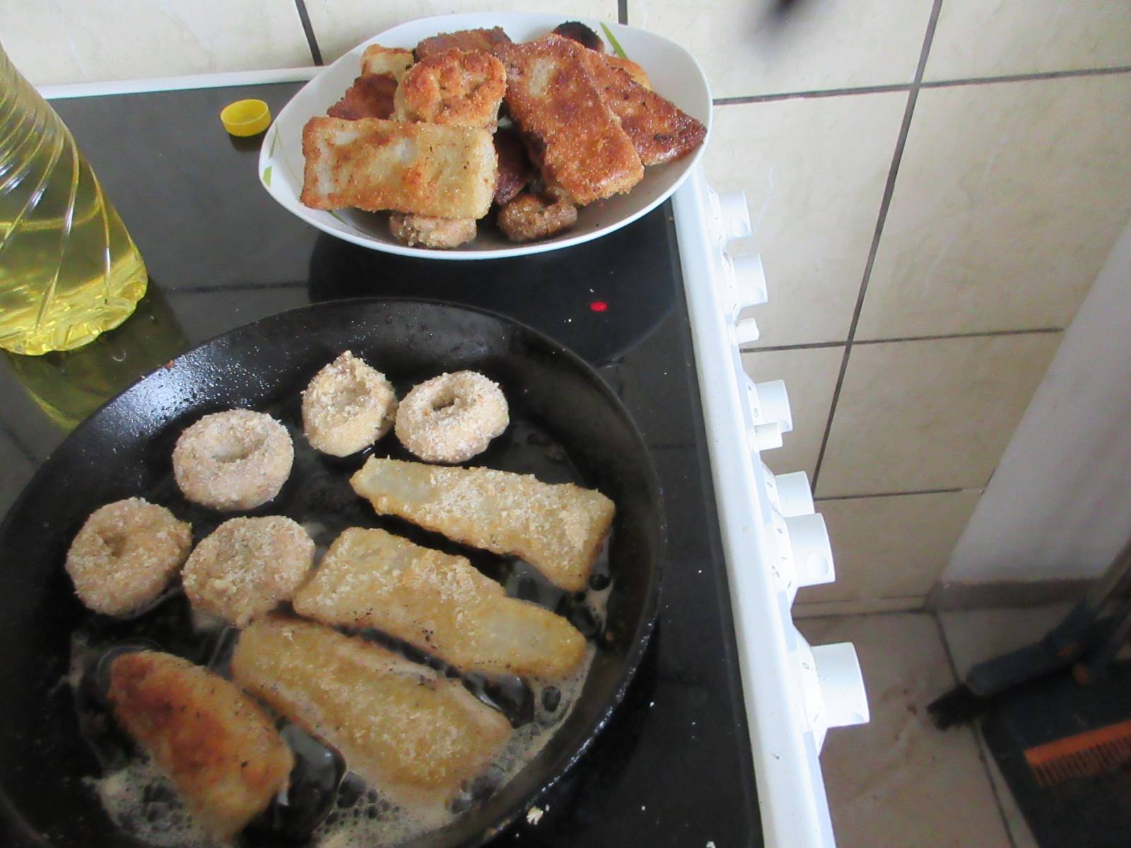 Před časem si stěžoval Petr, že už se sem nedávají žádná jídla. Tak mně napadlo, že vám dnes dám můj oběd. Je naprosto jednoduchý. Ředkev smažená a žampiony. Ředkev trochu uvařit a obalit v trojobale, nezapomenout osoli. 6ampiony obalit v trojobale a usmažit. Většinou dělám ze zbylého vajíčka nudle, ale dnes jem to trochu změnila. Nožičky od žampionu nakrájela na drobno, dala do vajíček, krapet strouhanky a uděla placičky na pánvi.